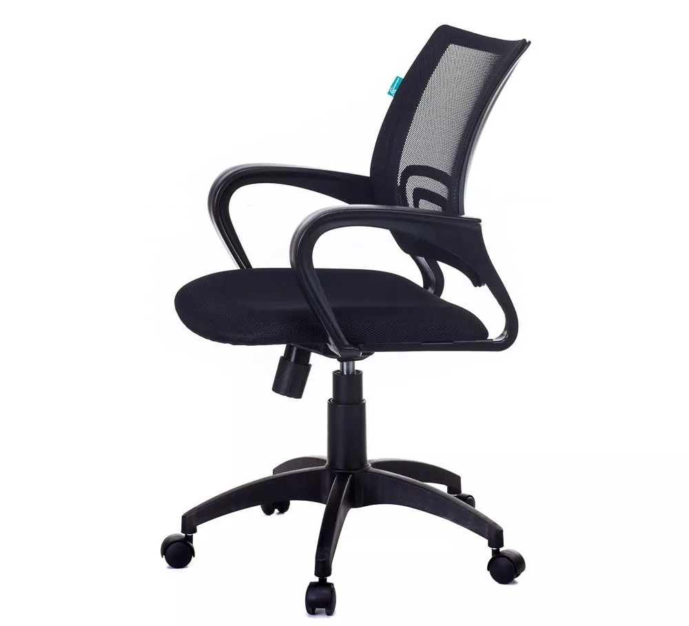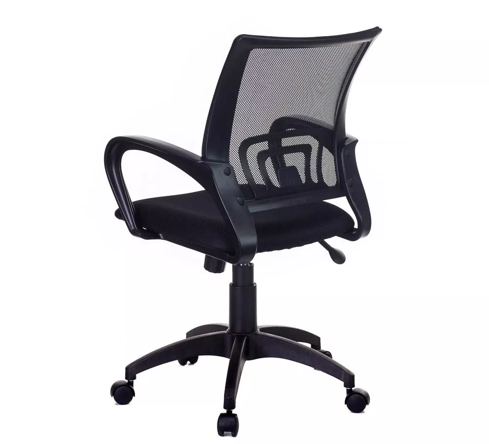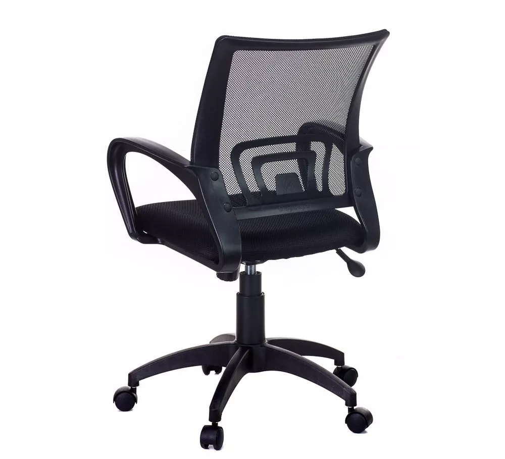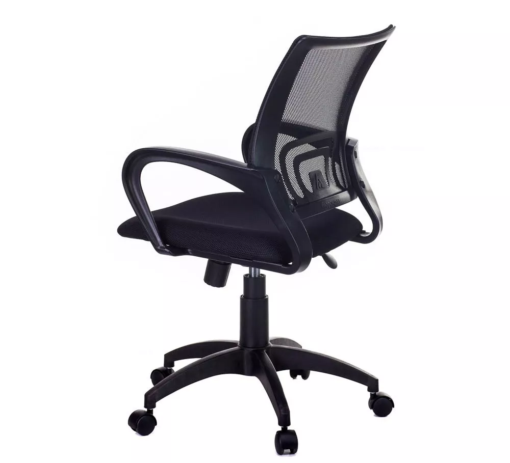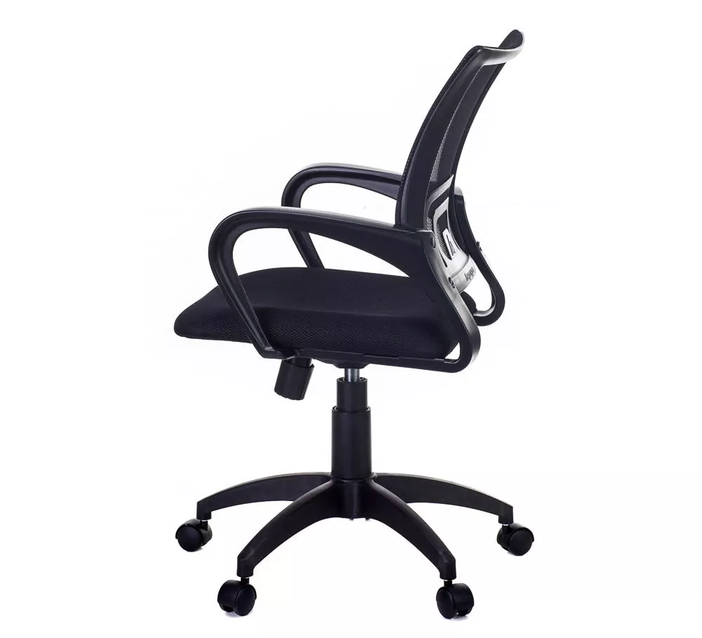Ткань черного цвета, которой обтянуто сидение кресла, отличается своей прочностью и износостойкостью. Предусмотрен механизм качания. Пятилучевая крестовина изготовлена из прочного пластика. В сочетании с поворотными колесиками, она позволяет креслу легко и бесшумно передвигаться по любому напольному покрытию. Ограничения - вес более 120 кг.