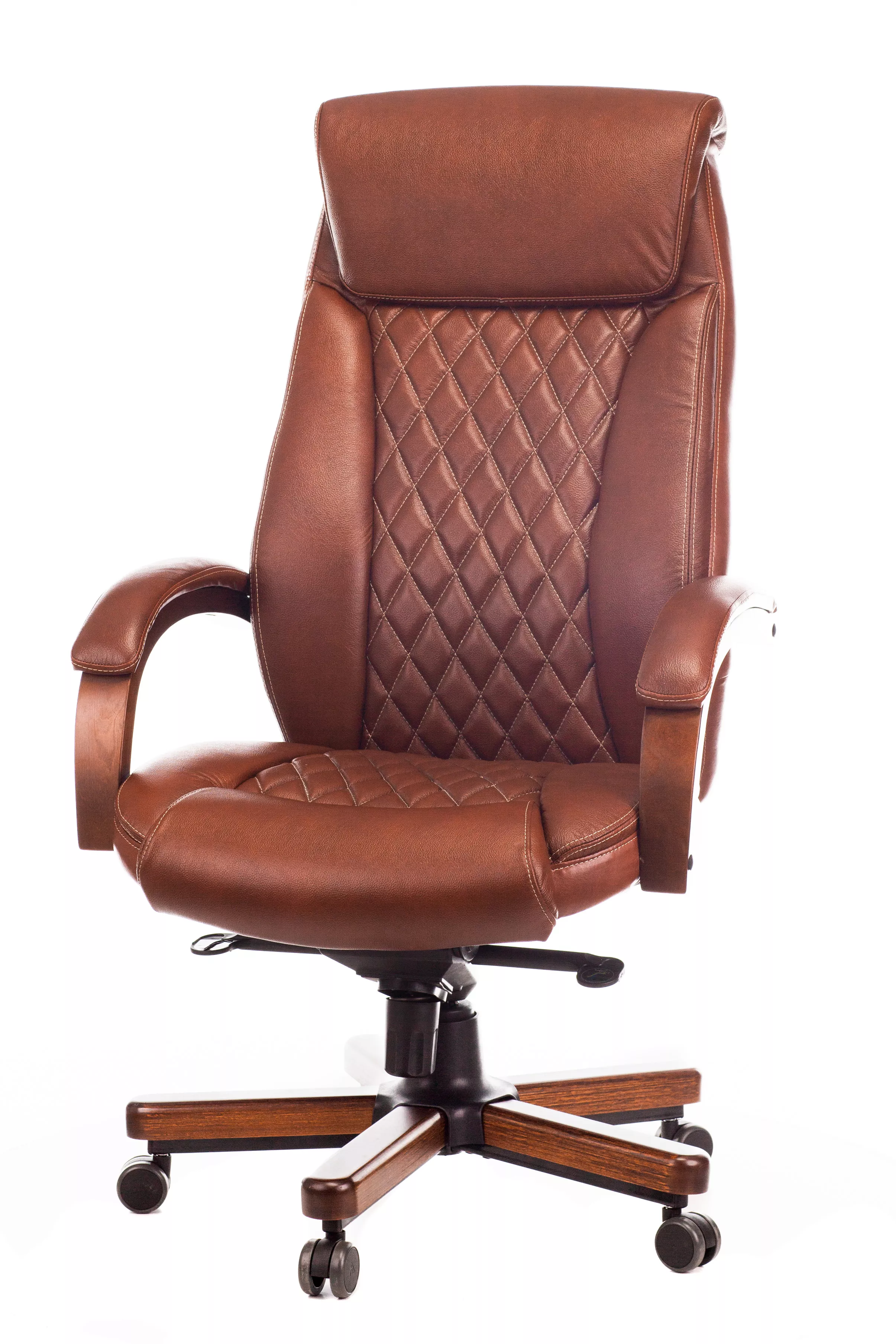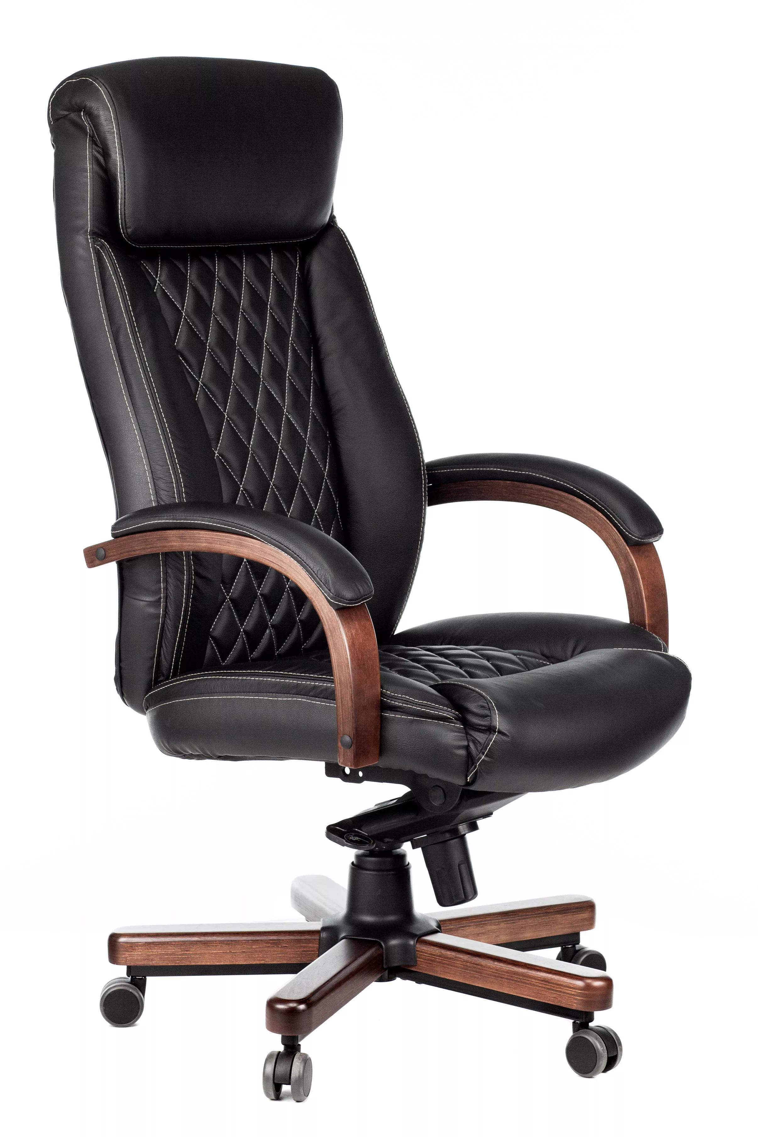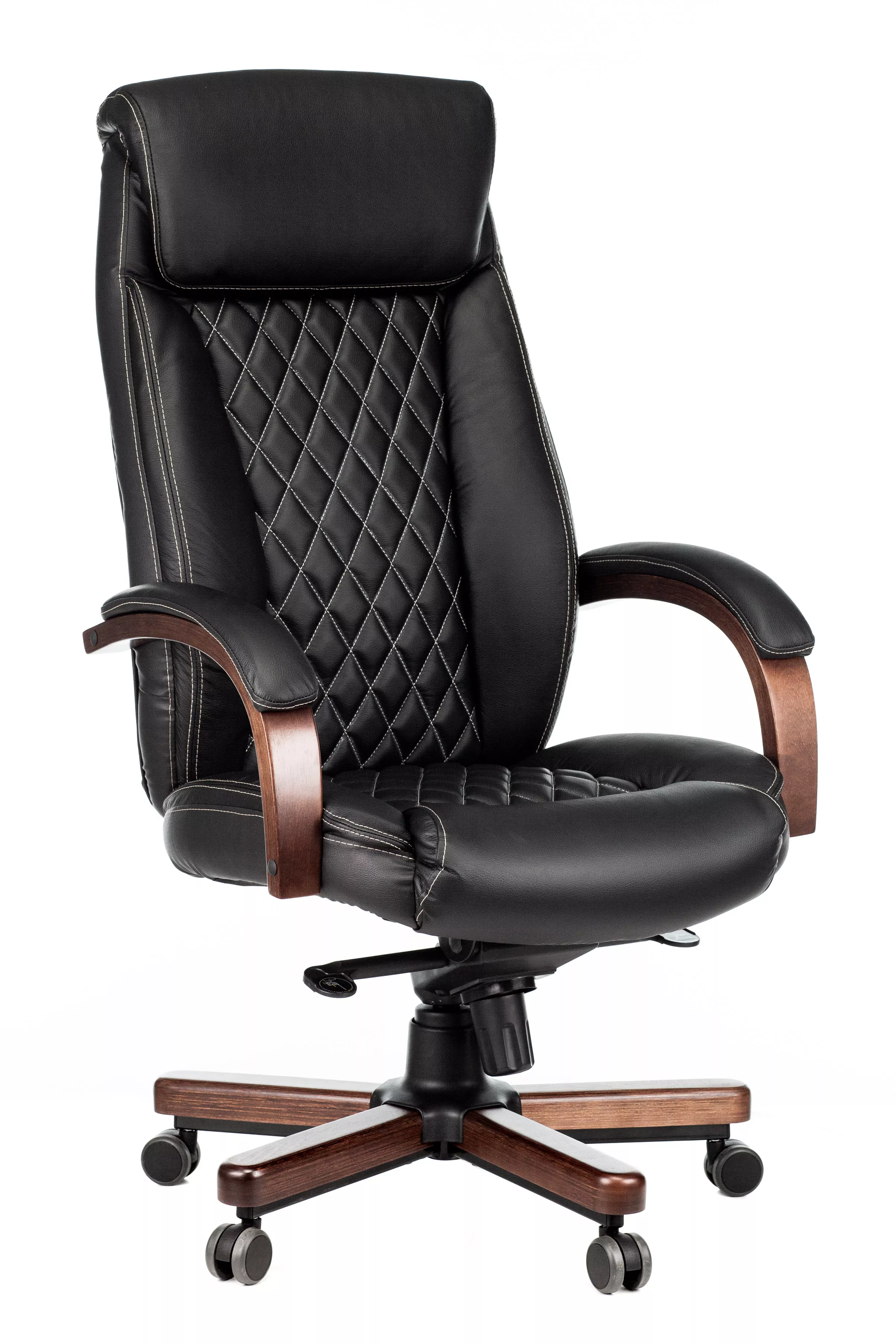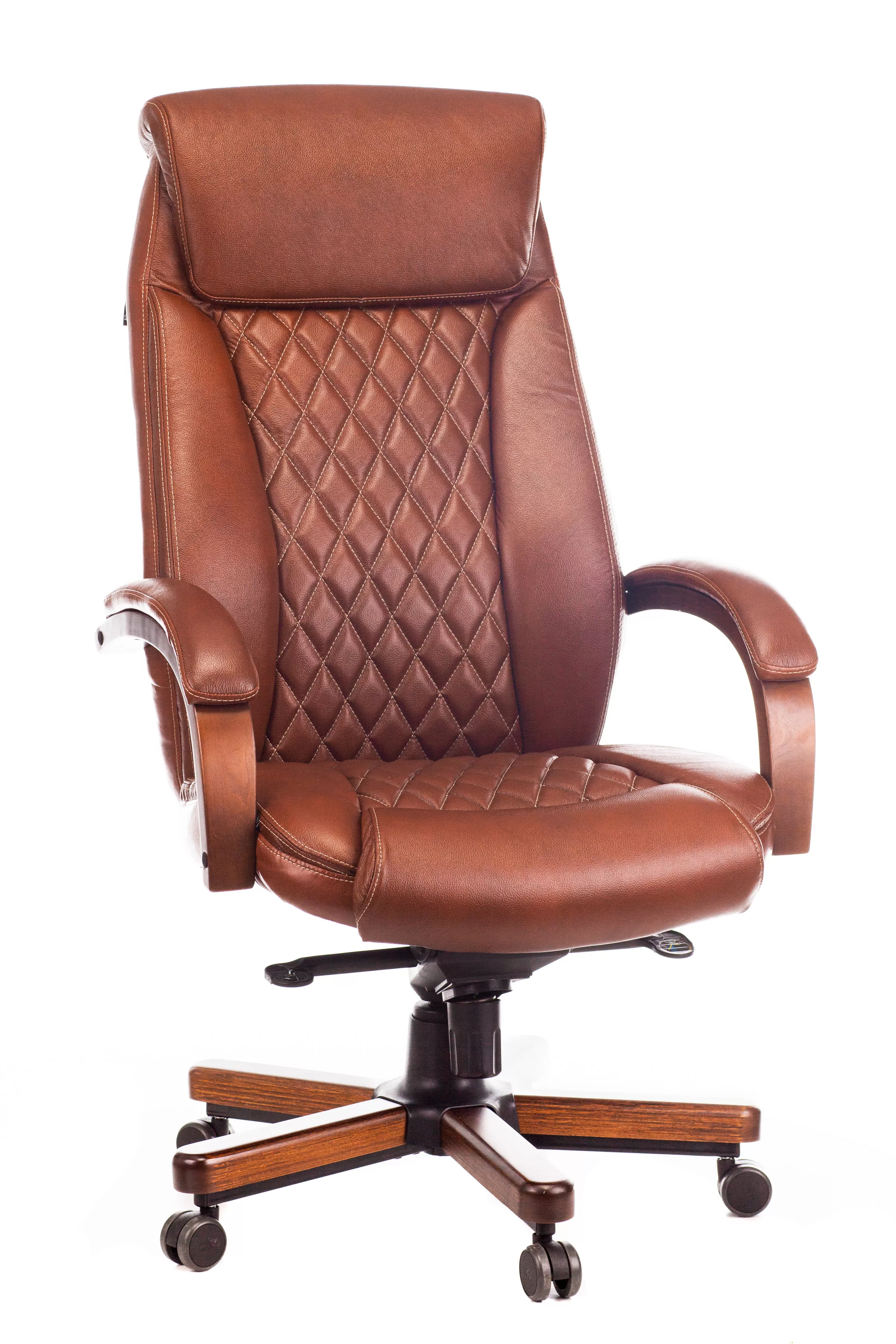 Элегантный дизайн спинки с выпуклыми рельефными боковинами и накладным подголовником обеспечивают удобную мягкую посадку и правильную поддержку спины, без симптомов усталости. Фигурное тиснение «мелкие ромбы» на средней части спинки и сиденья, изогнутые подлокотники с кожаными накладками создают изысканный дизайн и мягкий массажный эффект.