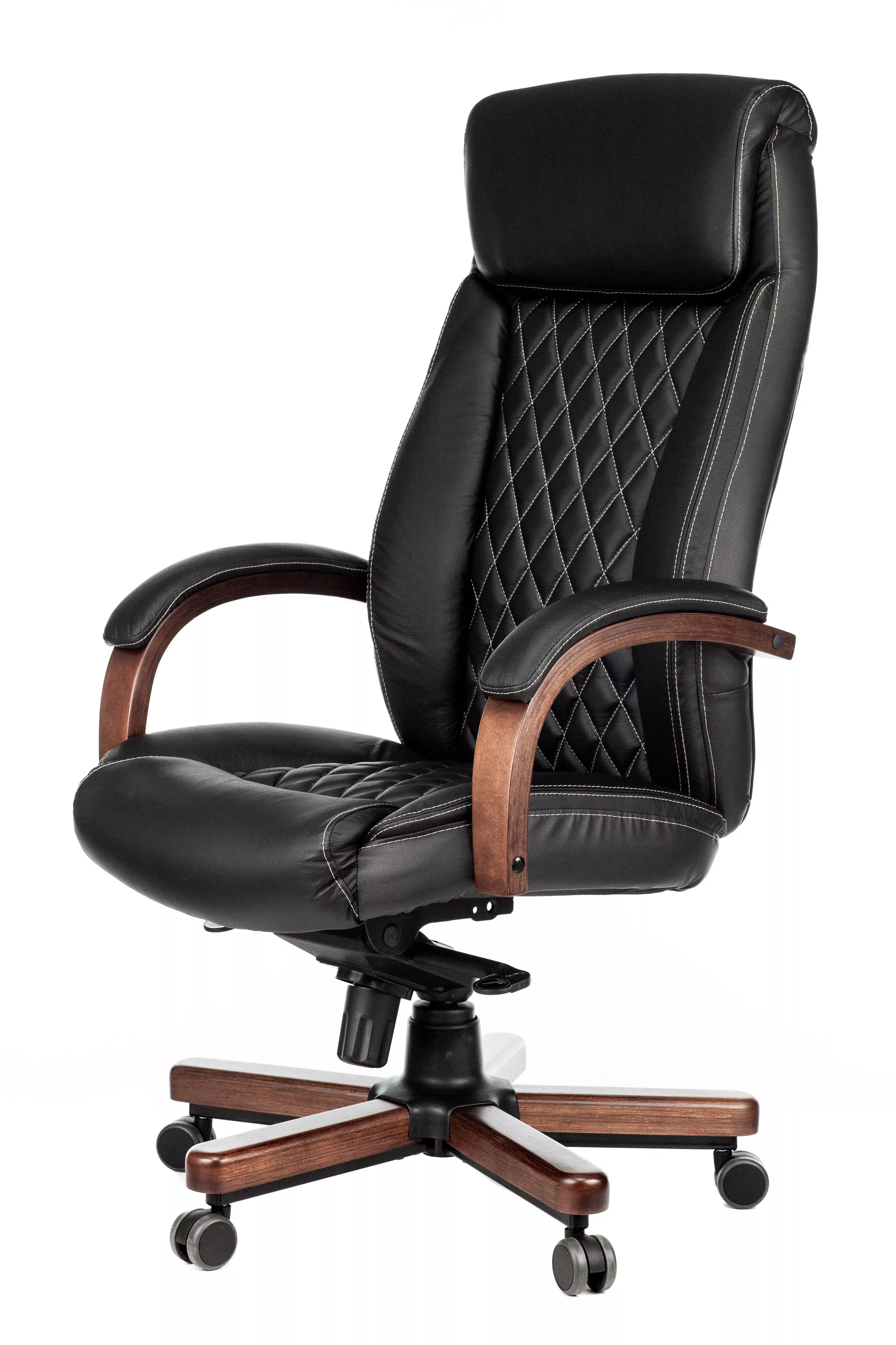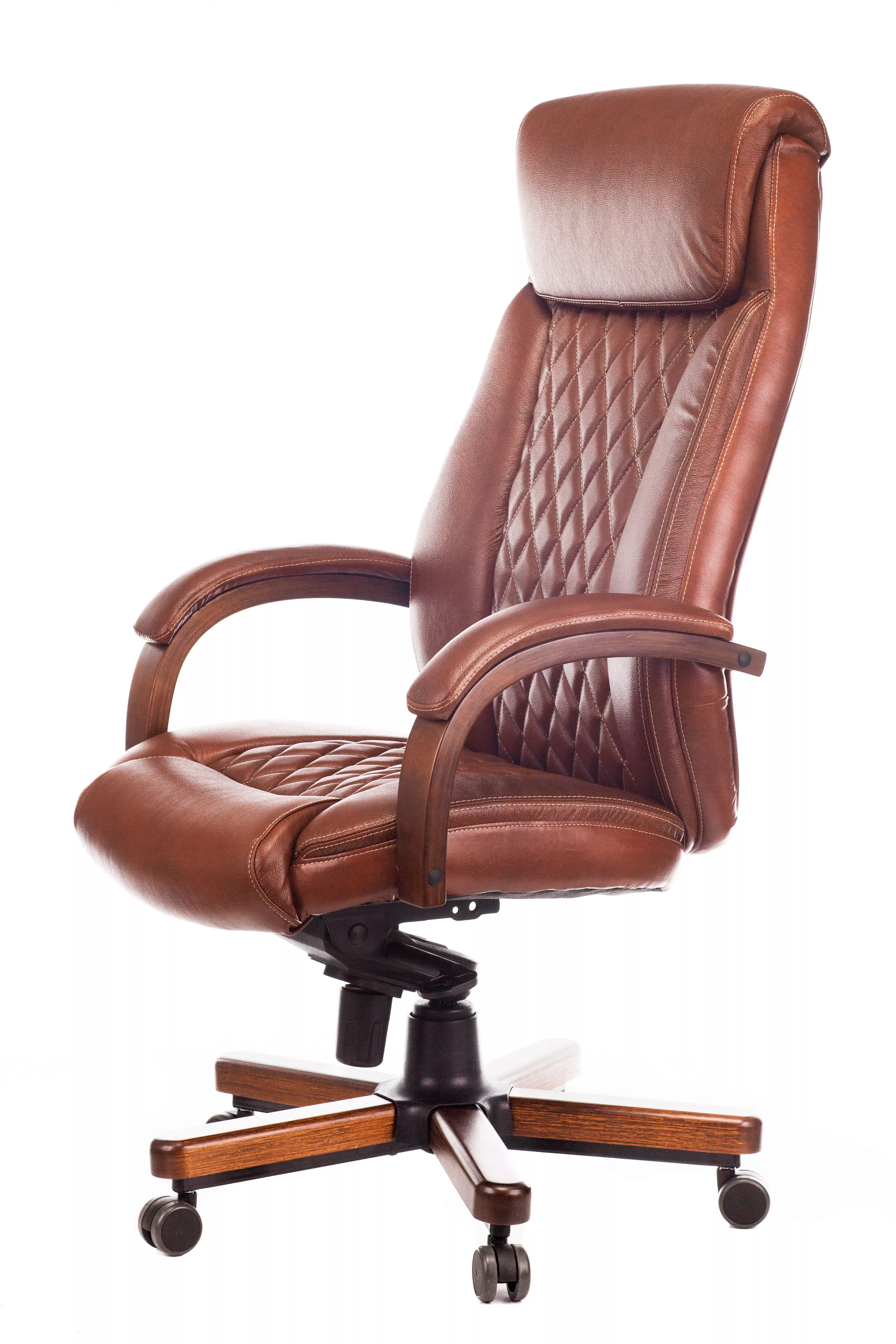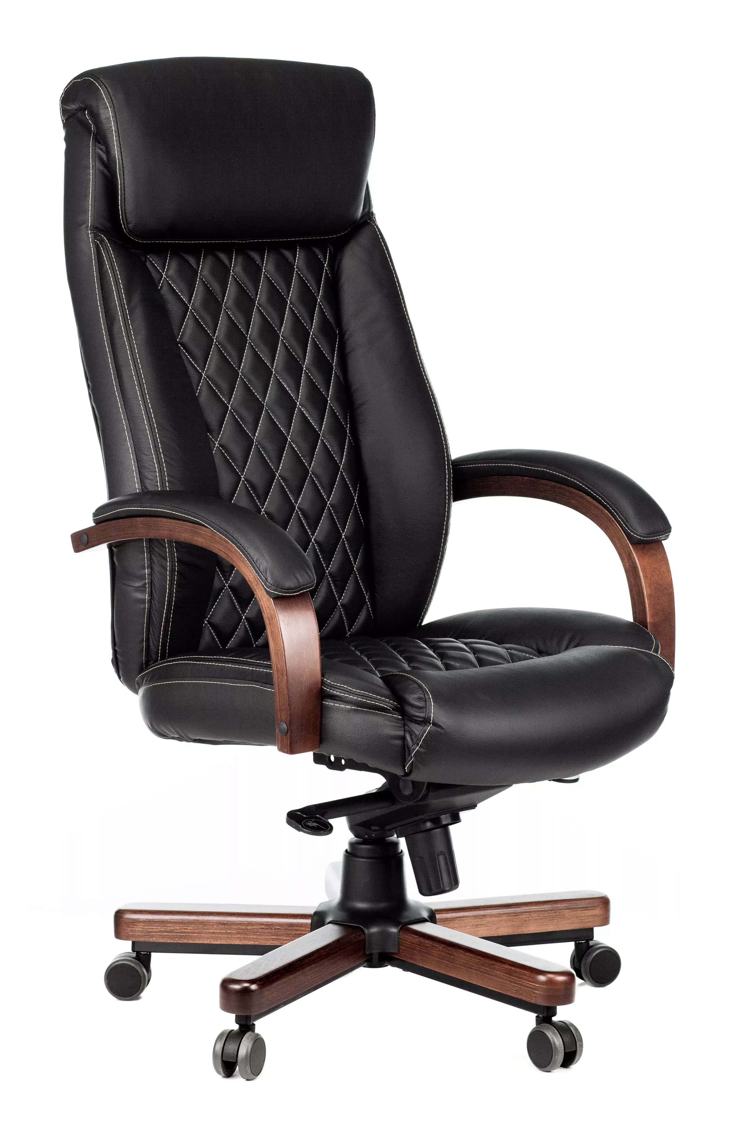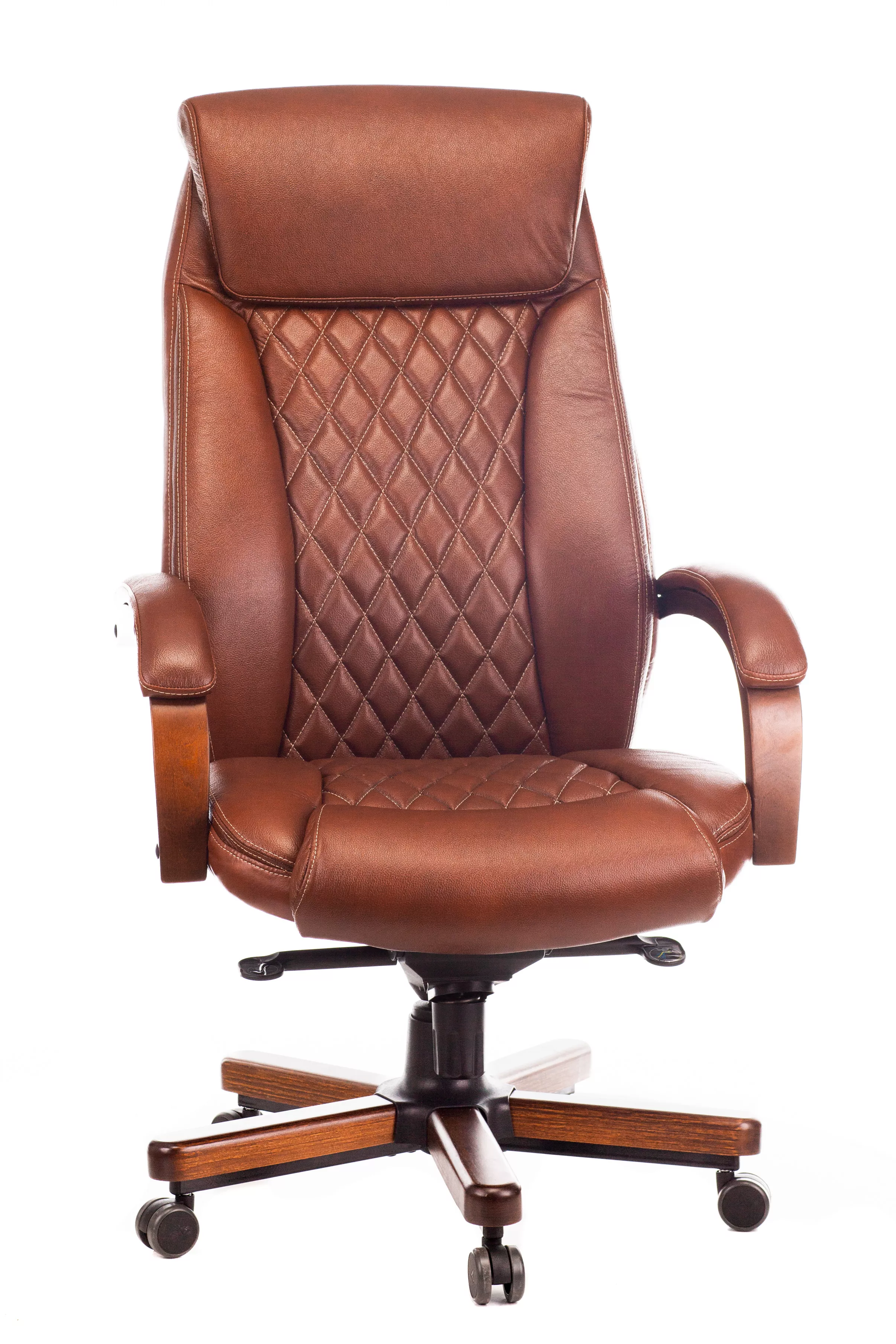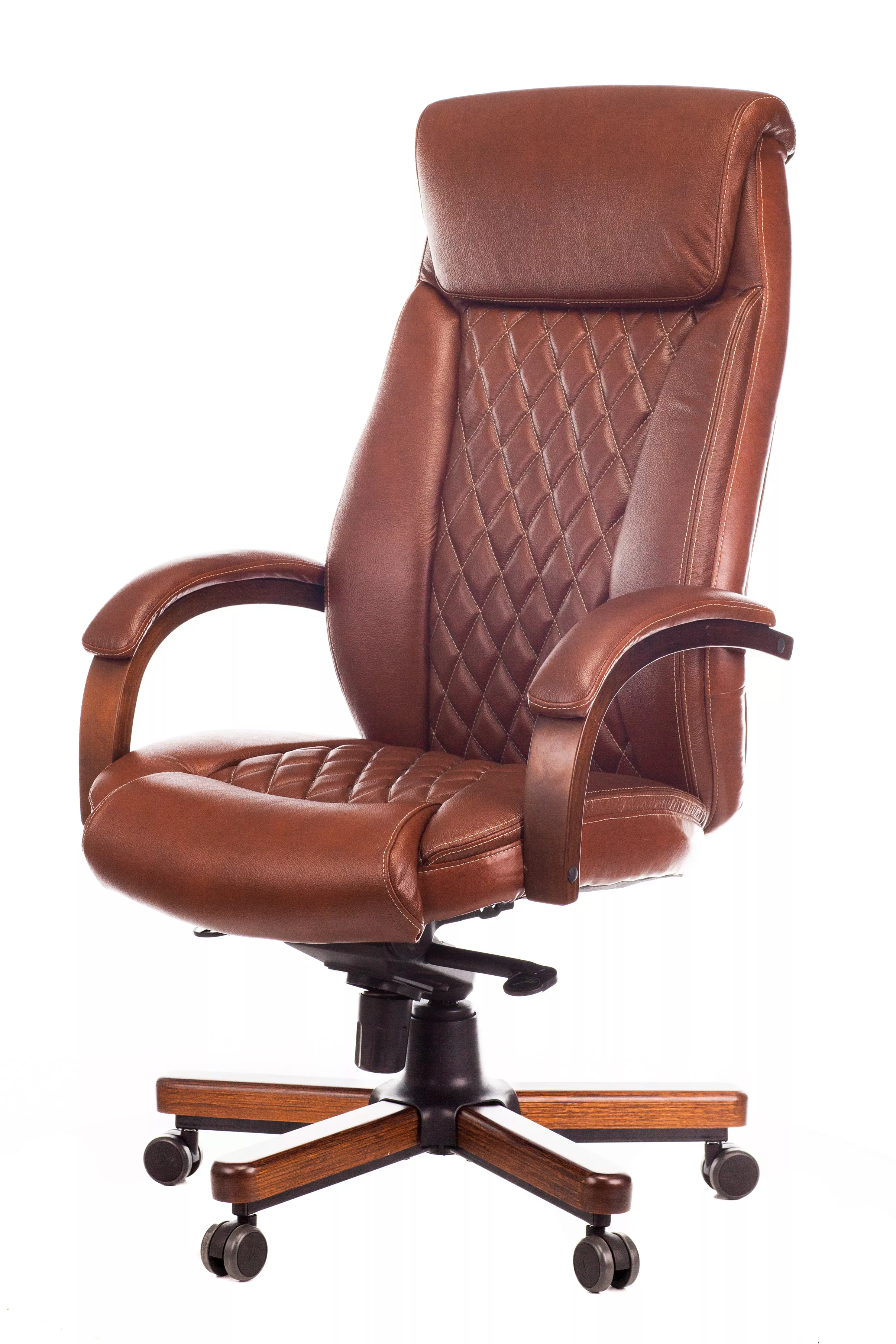 Элегантный дизайн спинки с выпуклыми рельефными боковинами и накладным подголовником обеспечивают удобную мягкую посадку и правильную поддержку спины, без симптомов усталости. Фигурное тиснение «мелкие ромбы» на средней части спинки и сиденья, изогнутые подлокотники с кожаными накладками создают изысканный дизайн и мягкий массажный эффект.