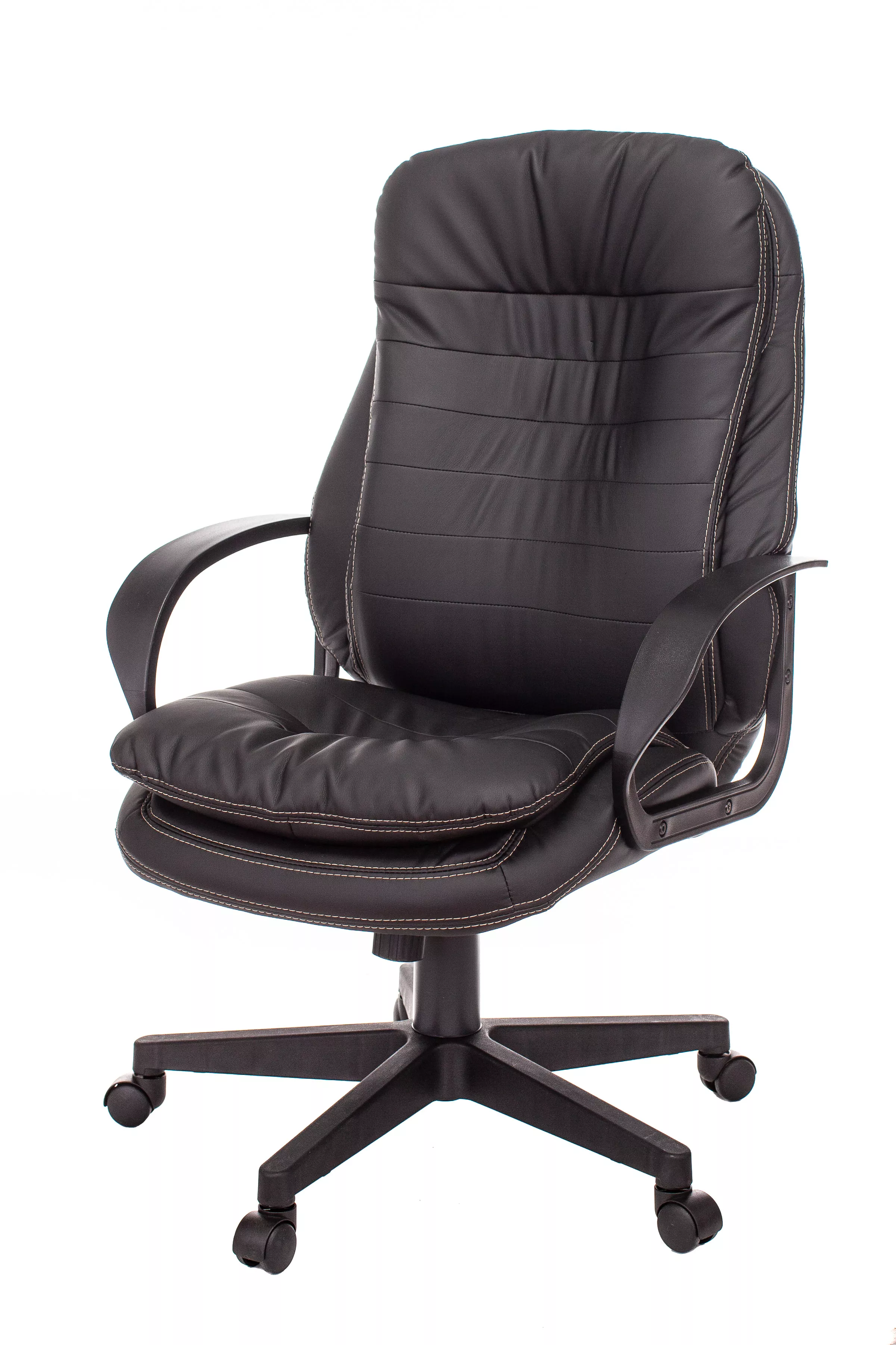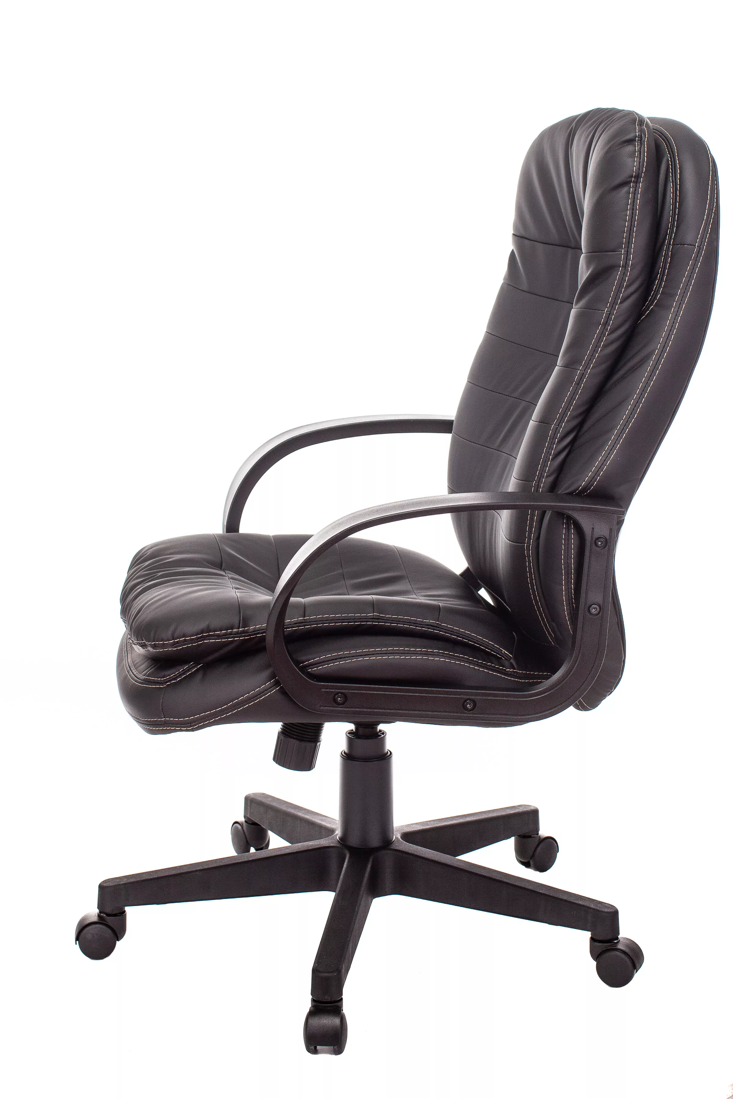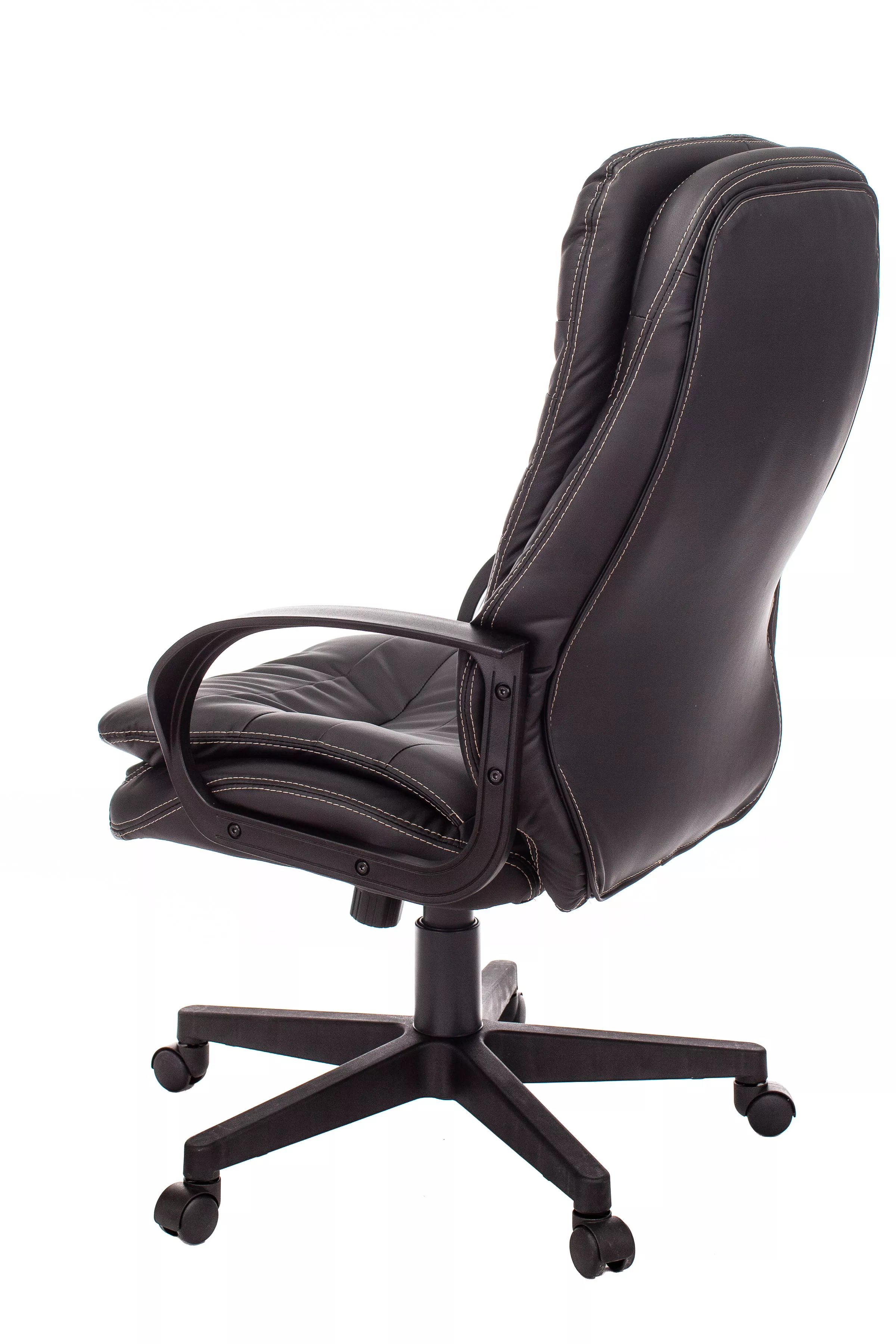 Обивка кресла выполнена из высококачественной экокожи черного цвета, которая не только стильно смотрится, но и легко чистится. Спинка кресла отделена от сиденья, что позволяет обеспечить лучшую вентиляцию и комфорт при длительном сидении. Высота кресла варьируется от 1065 мм до 765 мм с подлокотниками, а высота сиденья составляет 495 мм. Ширина сиденья — 565 мм, а глубина — 460 мм, что обеспечивает достаточное пространство для комфортного размещения.