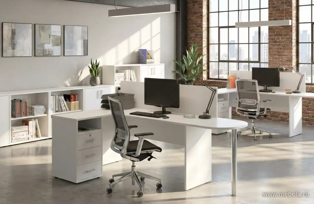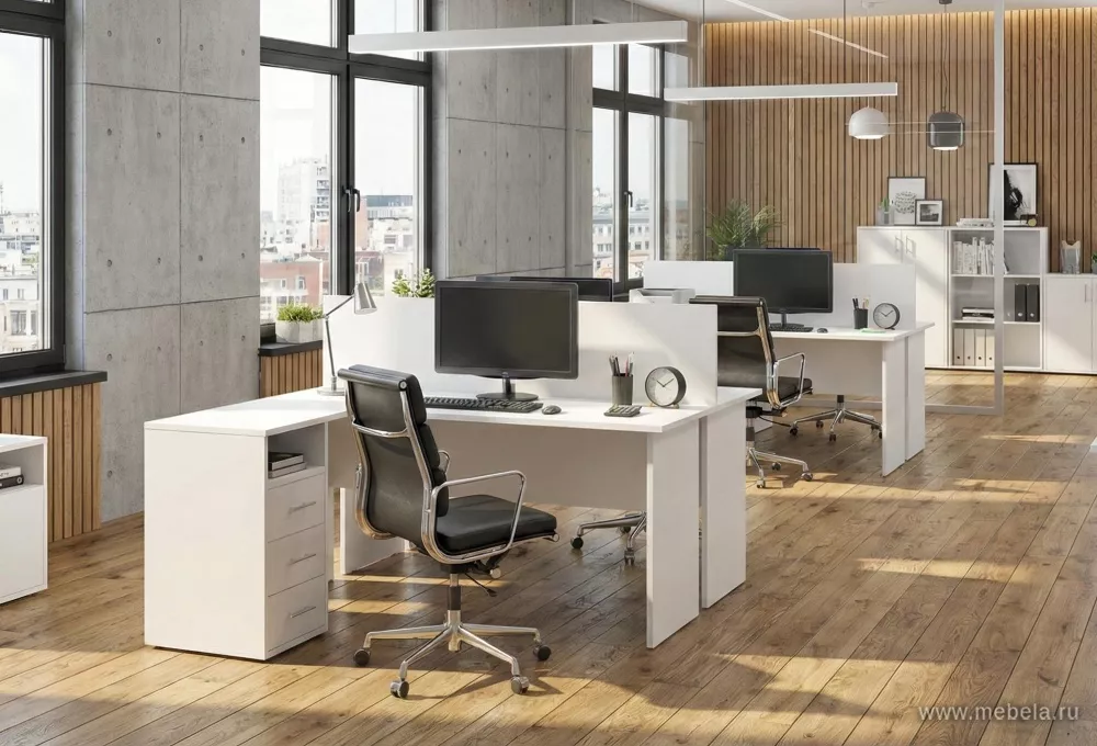 Лаконичный комплект мебели для офиса в белом цвете. Мебель Тренд (Trend) этой серии обычно покупают, чтобы оборудовать рабочие места для линейных сотрудников. Письменные столы из комплекта комбинируются друг с другом, разделяя пространство на отдельные рабочие зоны.