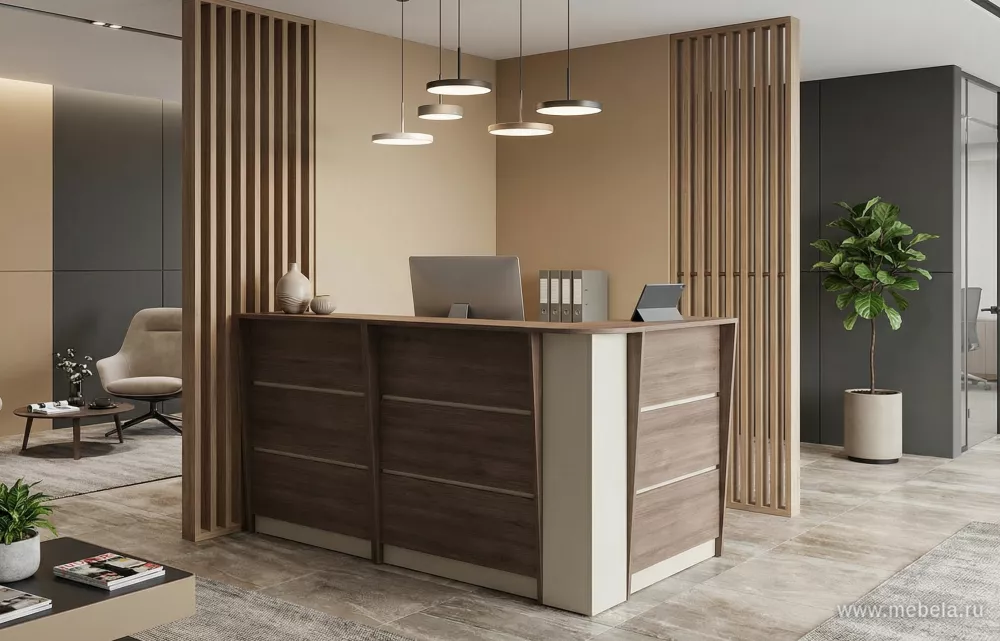 Стойка ресепшн New Line - стильное и лаконичное исполнение модуля в модных оттенках «дуб шамони светлый» и «дуб шамони тёмный», в искусном сочетании с бежево-песочными элементами. Прямые строгие линии, оптимальная высота стойки и продуманность деталей создают уникальный стиль Хай-Тек в приемной офисной зоне.