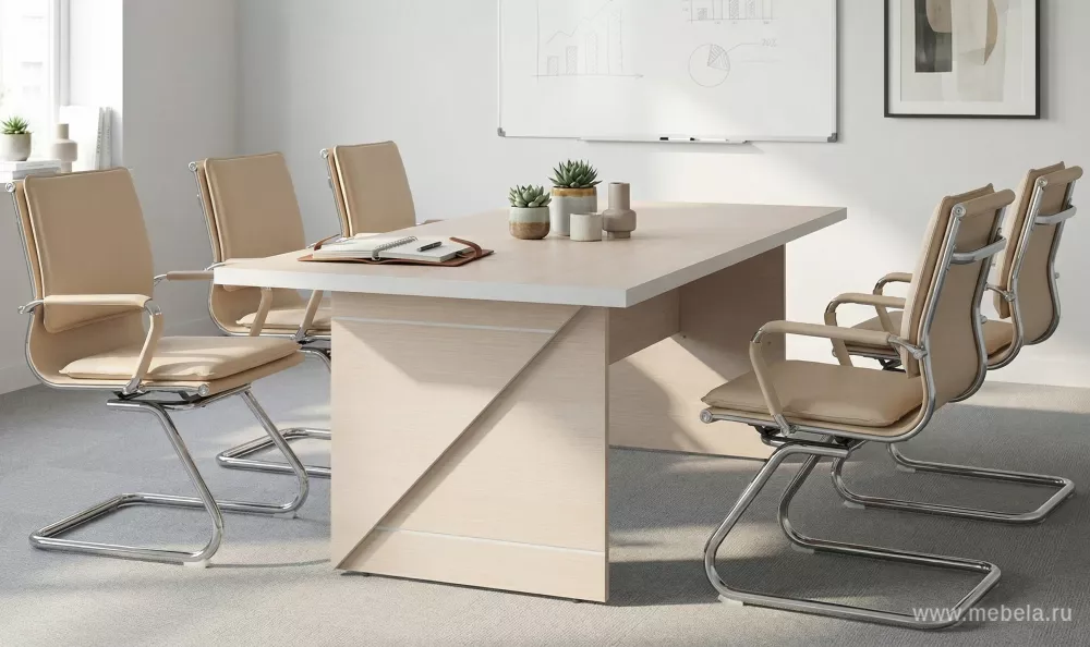 Если вы хотите внести в свой офис изюминку оригинальности и сделать его непохожим ни на один другой, то столы для переговоров Zoom реализуют такой замысел превосходно. Их уникальный декор боковых опор и отделка торцовых элементов панелей обеспечивают динамичный яркий образ.